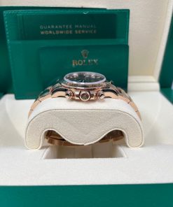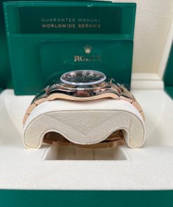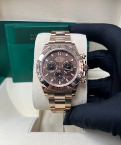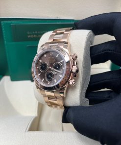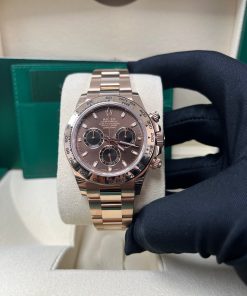 40mm 18K Everose gold case, screw-down crown and push buttons, fixed Everose gold bezel with engraved tachymetric scale, chocolate and black dial, index hour markers, Rolex calibre 4130 automatic movement, 18K Everosed gold Oyster bracelet, folding Oysterlock buckle with Easylink 5mm comfort extension link. Waterproof to 100 meters.
