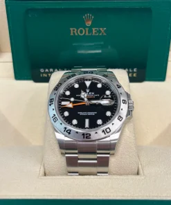 This Oyster Perpetual Explorer II in Oystersteel with an Oyster bracelet features a black dial with an arrow-shaped 24-hour hand and hour markers with a Chromalight display.