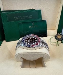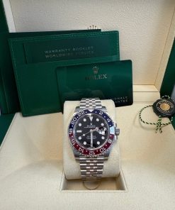 40mm Stainless steel case with Oystersteel monobloc middle case, screw-down crown, bidirectional rotatable 24-hour graduated bezel with Pepsi red and blue Cerachrom insert and engraved numerals, scratch-resistant sapphire crystal with cyclops lens over the date, black dial, hour markers set with Chromalight. Rolex calibre 3285 self-winding movement with the second time-zone hour hand and instantaneous date, approximately 70 hours of power reserve, stainless steel Jubilee bracelet with rounded five-piece links, folding Oysterlock buckle with Easylink 5mm comfort extension link. Water-resistant up to 100 meters.