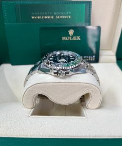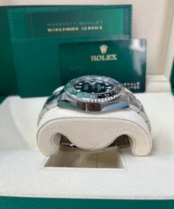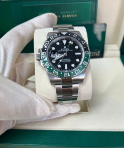 The Rolex GMT-Master II Sprite 126720VTNR combines style and functionality, making it a favorite among luxury watch enthusiasts. Crafted from durable Oystersteel, this 40mm timepiece features a striking green and black Cerachrom bezel with 24-hour graduations and a scratch-resistant sapphire crystal. Powered by the calibre 3285, it offers dual time zone functionality, a 70-hour power reserve, and precision performance (-2/+2 sec/day). The black dial enhances legibility with Chromalight luminescence. Paired with an Oyster bracelet and folding safety clasp, it’s perfect for both intercontinental travel and everyday wear. Waterproof to 100 meters, this iconic watch is a testament to Rolex craftsmanship.