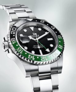 The Rolex GMT-Master II Sprite 126720VTNR combines style and functionality, making it a favorite among luxury watch enthusiasts. Crafted from durable Oystersteel, this 40mm timepiece features a striking green and black Cerachrom bezel with 24-hour graduations and a scratch-resistant sapphire crystal. Powered by the calibre 3285, it offers dual time zone functionality, a 70-hour power reserve, and precision performance (-2/+2 sec/day). The black dial enhances legibility with Chromalight luminescence. Paired with an Oyster bracelet and folding safety clasp, it’s perfect for both intercontinental travel and everyday wear. Waterproof to 100 meters, this iconic watch is a testament to Rolex craftsmanship.