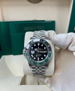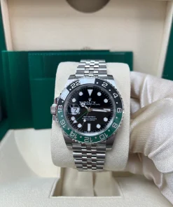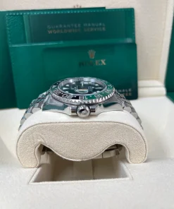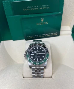 This model features a black dial and a two-colour Cerachrom bezel insert in green and black ceramic. In addition to conventional hour, minute and seconds hands, the GMT-Master II features an arrow-tipped hand, which circles the dial once every 24 hours, as well as a bidirectional rotatable 24-hour graduated bezel.