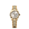 This dial features diamonds in 18 ct gold settings and a Roman IX in 18 ct gold, set with 8 diamonds. The sunray finish creates delicate light reflections on many dials in the Oyster Perpetual collection. It is obtained using masterful brushing techniques that create grooves running outwards from the centre of the dial.