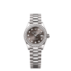 This Lady-Datejust is offered on a prestigious President bracelet. Always in solid gold or platinum, the bracelets benefit from a concealed attachment beneath the bezel which ensures seamless visual continuity between the bracelet and case.