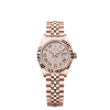 This Oyster Perpetual Lady-Datejust in 18 ct Everose gold features a white mother-of-pearl, diamond-set dial and a Jubilee bracelet.