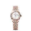 This Oyster Perpetual Lady-Datejust in 18 ct Everose gold features an aubergine, diamond-set dial and a Jubilee bracelet.