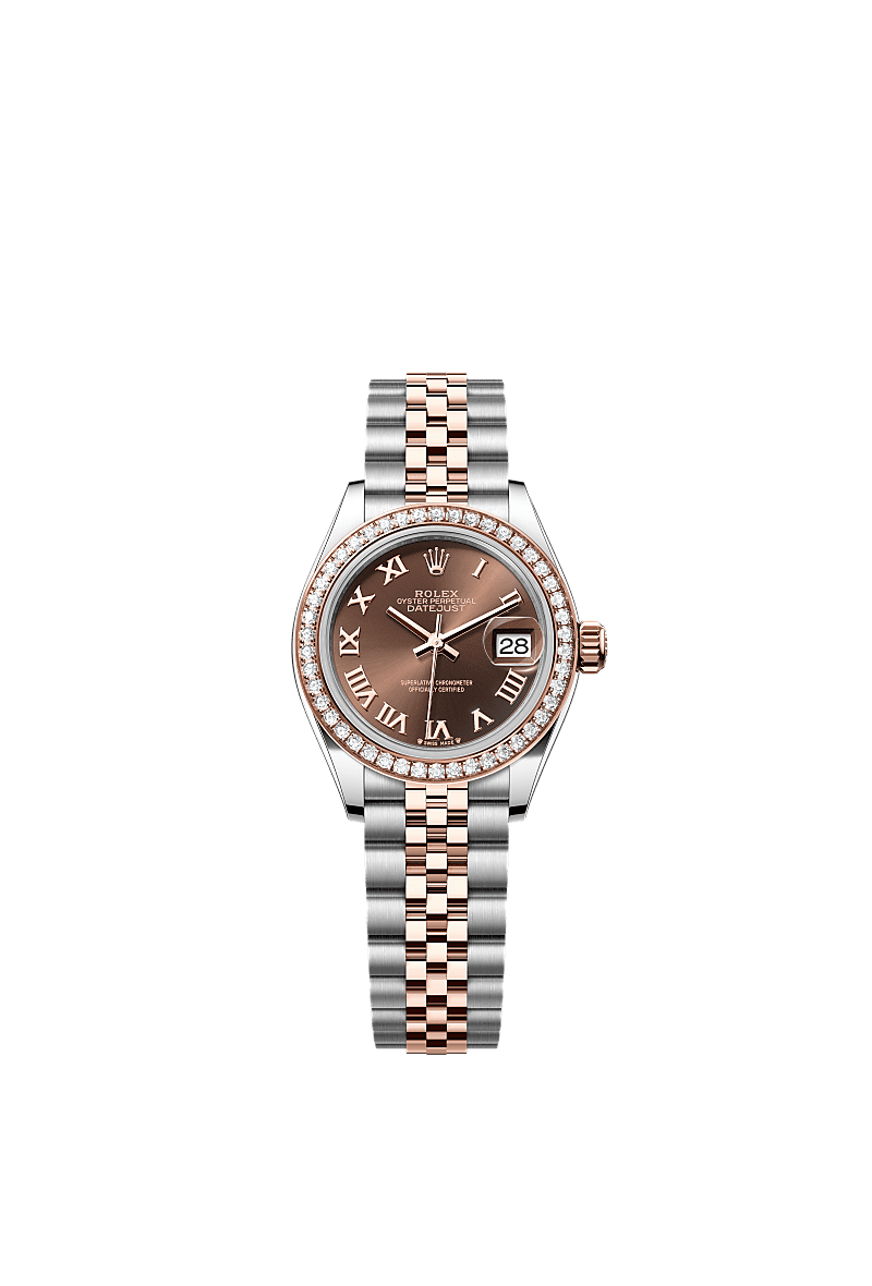 This Oyster Perpetual Lady-Datejust in Oystersteel and Everose gold features a chocolate dial and a Jubilee bracelet.