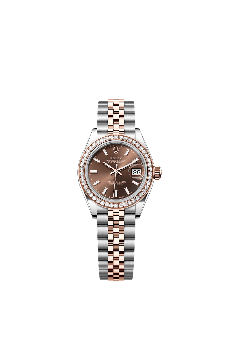 This Oyster Perpetual Lady-Datejust in Oystersteel and Everose gold features a chocolate dial and a Jubilee bracelet.