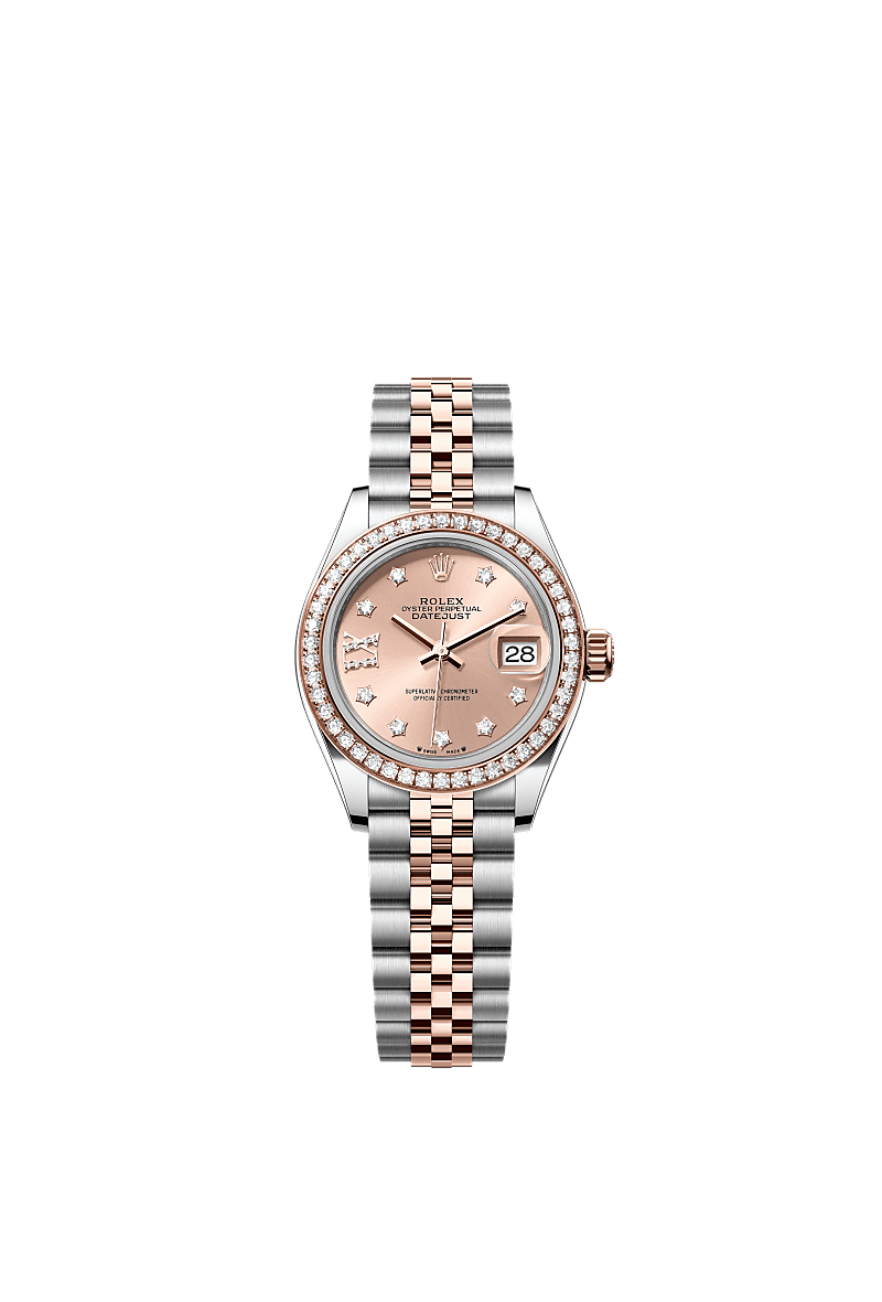This Oyster Perpetual Lady-Datejust in Oystersteel and Everose gold features a rosé colour, diamond-set dial and a Jubilee bracelet.