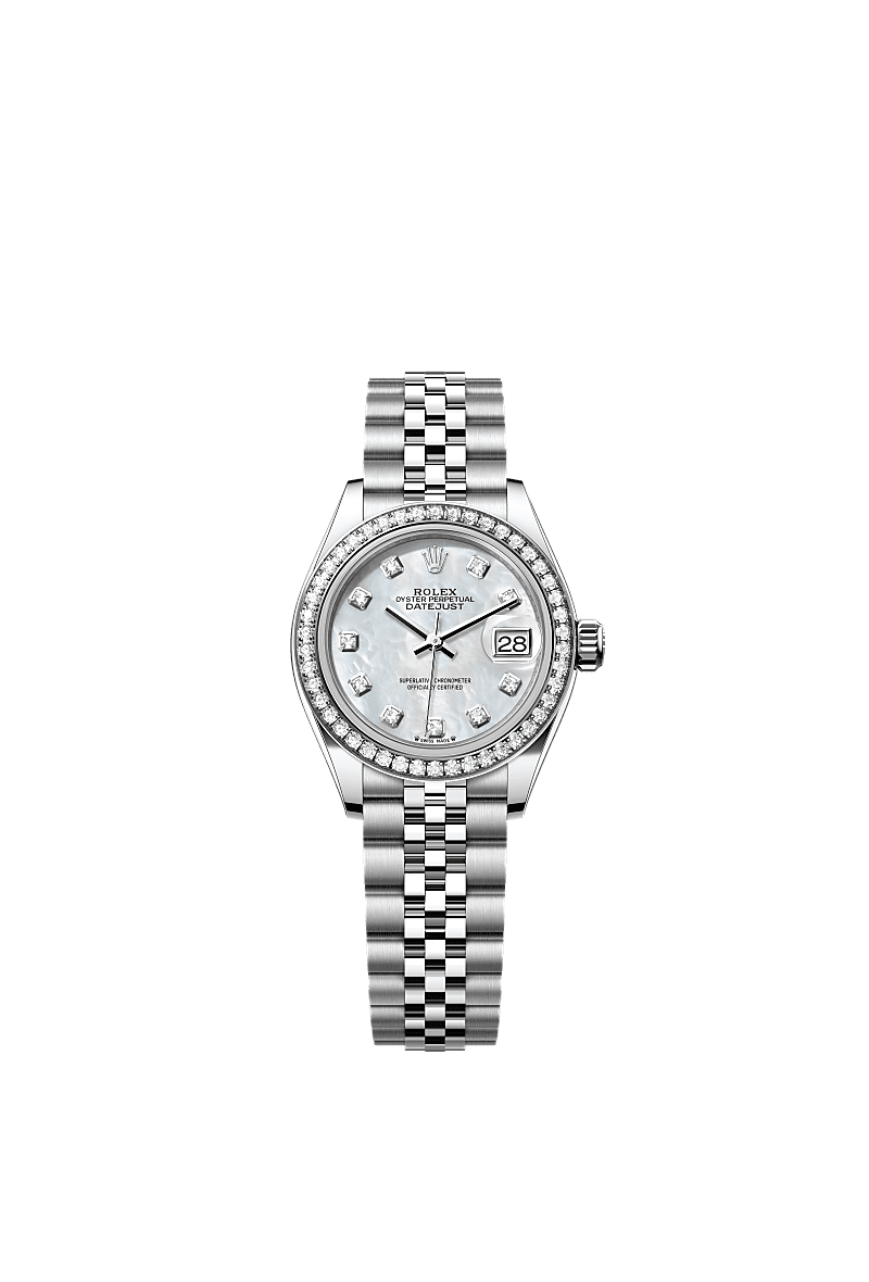 This Oyster Perpetual Lady-Datejust in Oystersteel and white gold features a white mother-of-pearl, diamond-set dial and a Jubilee bracelet.