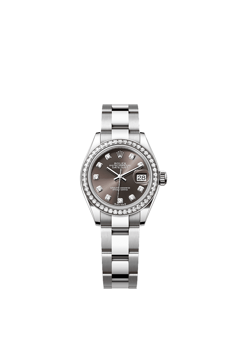 This Oyster Perpetual Lady-Datejust in Oystersteel and white gold features a dark grey, diamond-set dial and an Oyster bracelet.