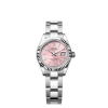 This Oyster Perpetual Lady-Datejust in Oystersteel and Everose gold features a white mother-of-pearl, diamond-set dial and a Jubilee bracelet.