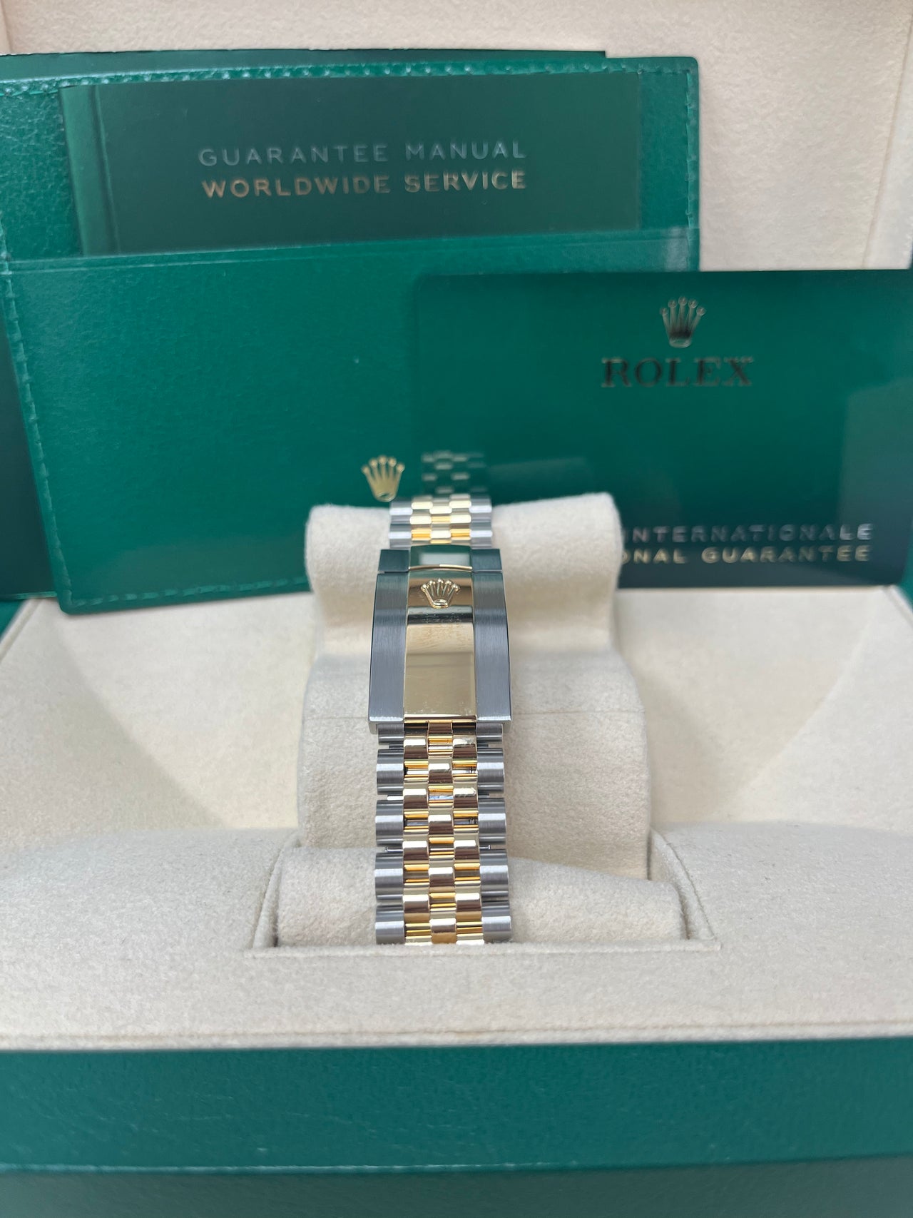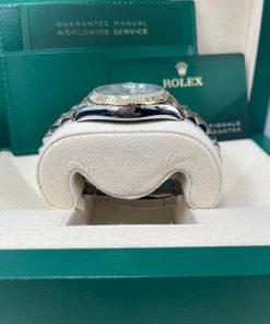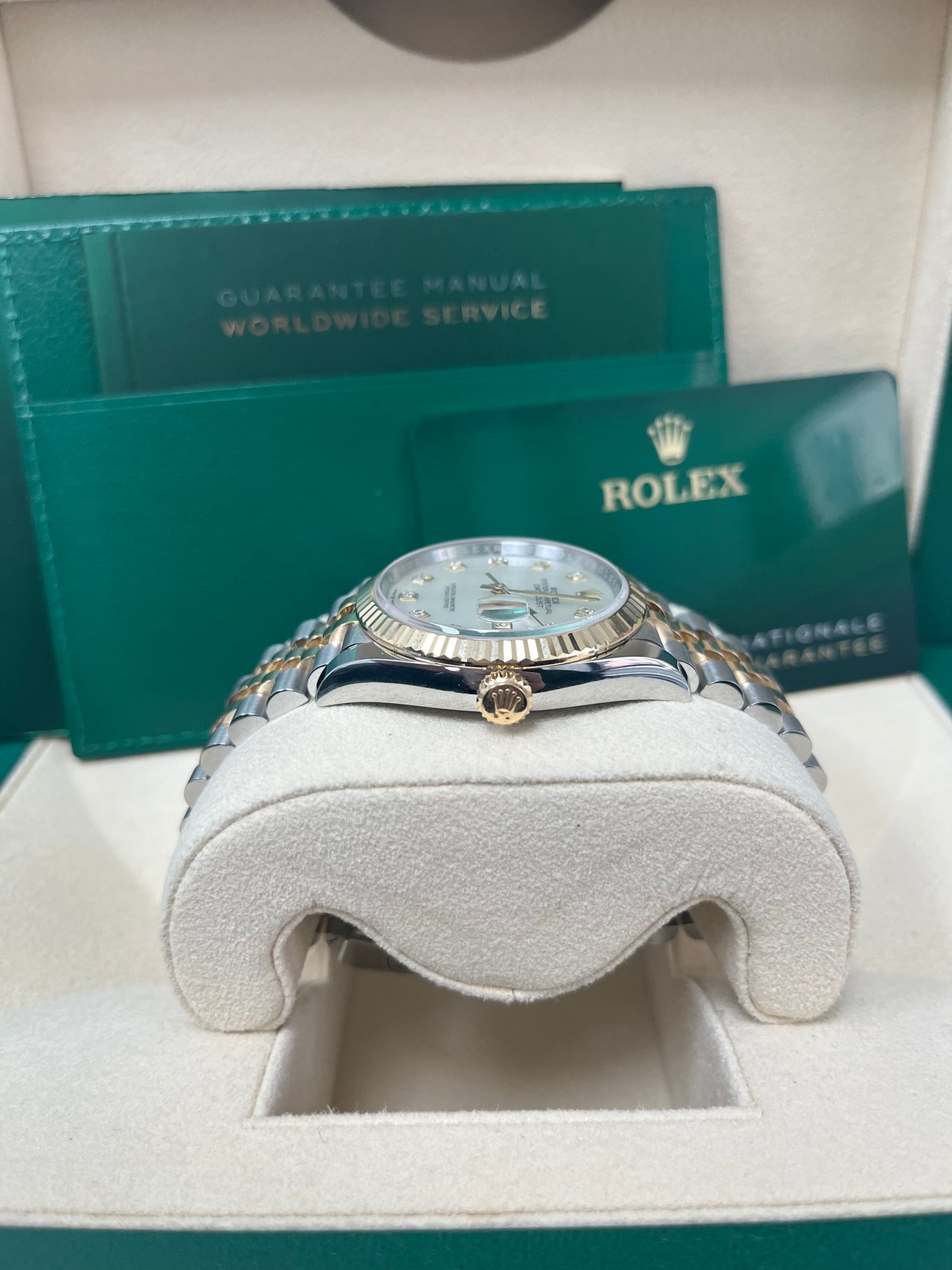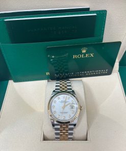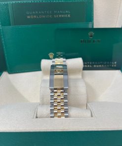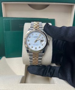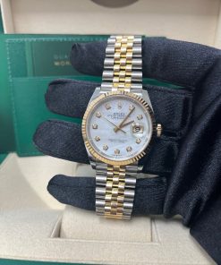 36mm yellow Rolesor case with Oystersteel monobloc middle case, screw-down steel back, screw-down 18K yellow crown, 18K yellow fluted bezel, white mother-of-pearl dial, 10 diamond hour markers, Rolex calibre 3235 self-winding movement with date at 3 o’clock, approximately 70 hours of power reserve, yellow Rolesor Jubilee bracelet with five-piece links, folding Oysterclasp buckle with Easylink 5mm comfort extension link. Waterproof to 100 meters. Redesigned for Baselworld 2018 with updated case sides, lugs, and calibre 3235 movement.