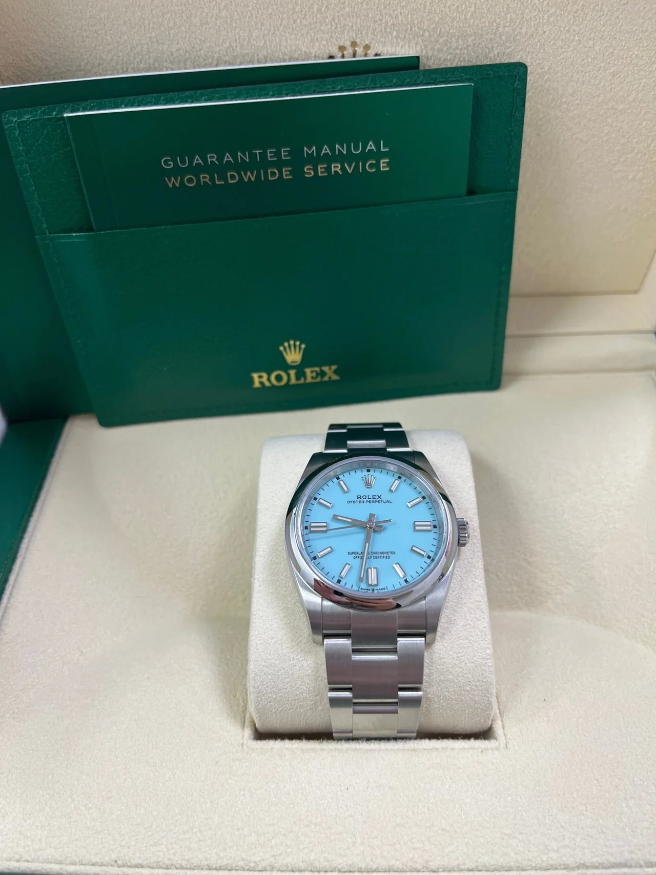 The Oyster Perpetual 36 with a turquoise blue dial and an Oyster bracelet.