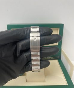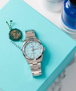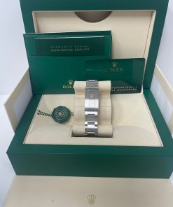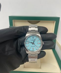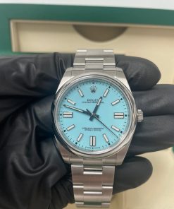 41mm Oystersteel case, screw-down crown with twin lock double waterproofness system, domed bezel, scratch-resistant sapphire crystal, turquoise bright blue dial, index hour markers, Rolex calibre 3230 automatic movement with center hour, minute and seconds hands, and stop-seconds for precise time setting, approximately 70 hours of power reserve, Oyster bracelet with flat three-piece links, folding Oysterclasp buckle with Easylink 5mm comfort extension link. Waterproof to 100 meters.