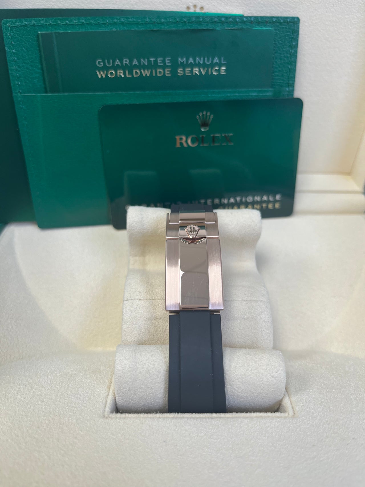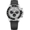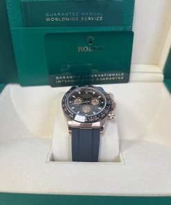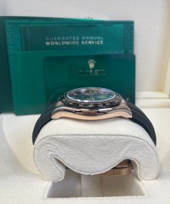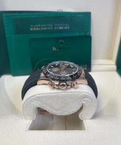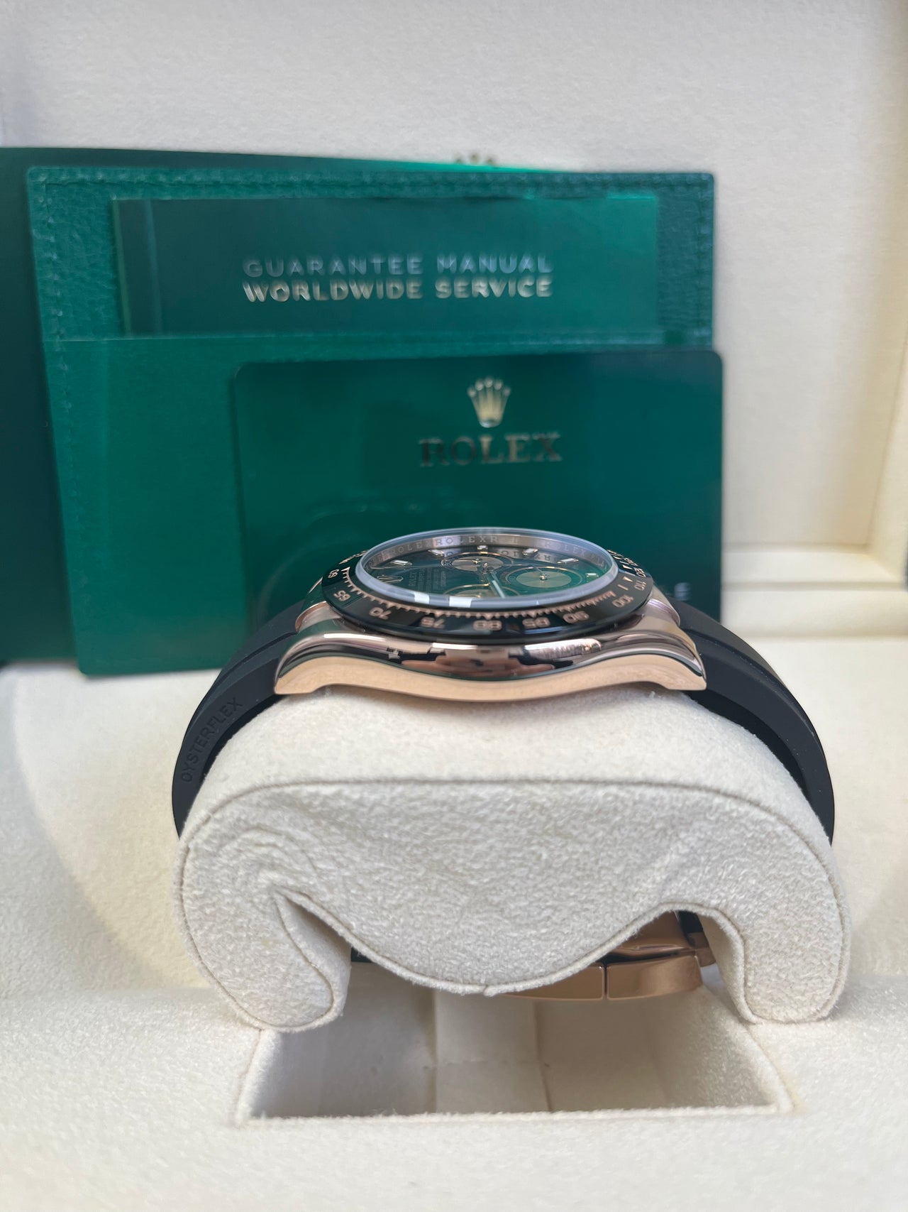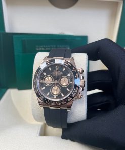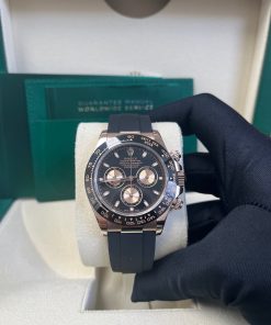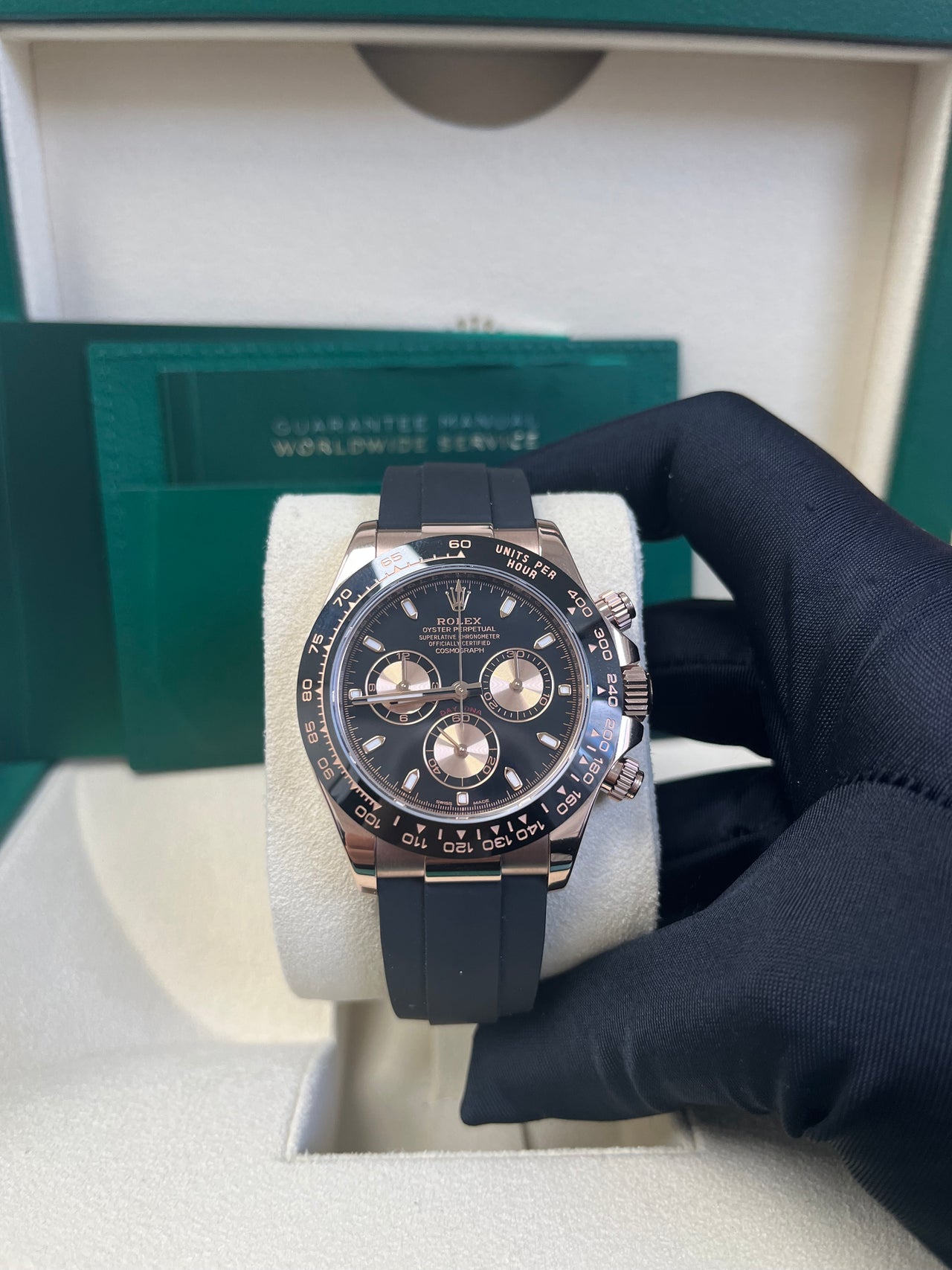 40mm 18K Everose gold case, screw-down Everose back, screw-down winding crown and push buttons with Triplock triple waterproofness, black monobloc Cerachrom bezel with engraved tachymetric scale, scratch-resistant double anti-reflective sapphire crystal, black dial with pink subdials, index hour markers, Rolex calibre 4130 perpetual self-winding movement with chronograph central second hand, 30-minute counter at 3 o’clock, and 12-hour counter at 9 o’clock, approximately 72 hours of power reserve, black Oysterflex strap made from flexible metal blades overmoulded with high-performance elastomer, Oysterlock folding safety buckle with Easylink 5mm rapid extension system. Waterproof to 100 meters.