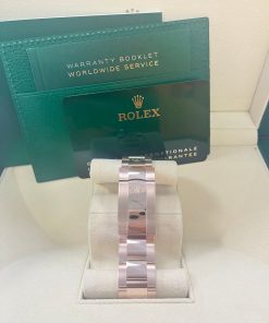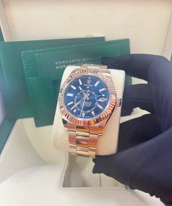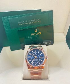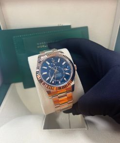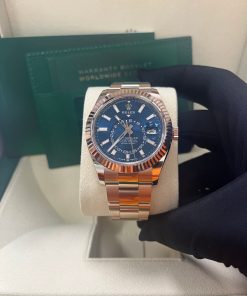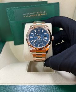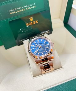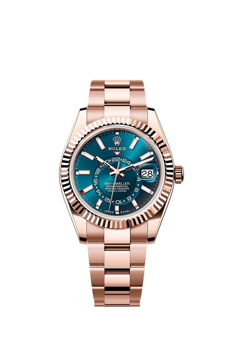 42mm 18K Everose gold case, screw-down back, screw-down crown with twinlock double waterproofness system, fluted, bidirectional rotatable rolex ring command bezel, scratch-resistant sapphire crystal with cyclops lens over the date, blue-green dial, index hour markers, 9002, manufacture Rolex perpetual self-winding, dual time zones, annual calendar movement with centre hour, minute and seconds hands, 24-hour display on off-centre disc, second time zone, instantaneous annual calendar at 3 o’clock and rapid-setting of the date, month display via 12 apertures around the circumference of the dial, and stop-seconds for precise time setting, approximately 72 hours of power reserve, Oyster bracelet with three-piece solid links, folding Oysterclasp buckle with Easylink 5mm comfort extension link. Waterproof to 100 metres / 330 feet.