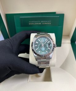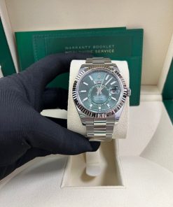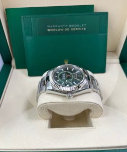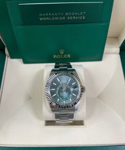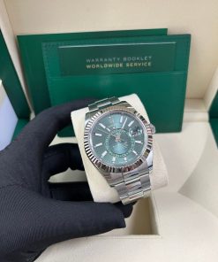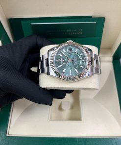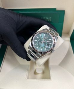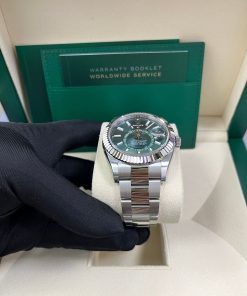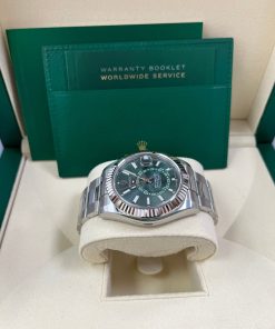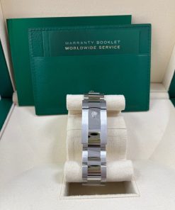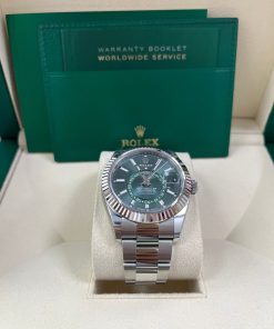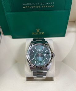 42mm white Rolesor case comprised of Oystersteel and white gold, screw-down back, screw-down crown with twinlock double waterproofness system, fluted, bidirectional rotatable rolex ring command bezel, scratch-resistant sapphire crystal with cyclops lens over the date, mint green dial, index hour markers, 9002, manufacture Rolex perpetual self-winding, dual time zones, annual calendar movement with centre hour, minute and seconds hands, 24-hour display on off-centre disc, second time zone, instantaneous annual calendar at 3 o’clock and rapid-setting of the date, month display via 12 apertures around the circumference of the dial, and stop-seconds for precise time setting, approximately 72 hours of power reserve, Oyster bracelet with three-piece solid links, folding Oysterclasp buckle with Easylink 5mm comfort extension link. Waterproof to 100 metres / 330 feet.