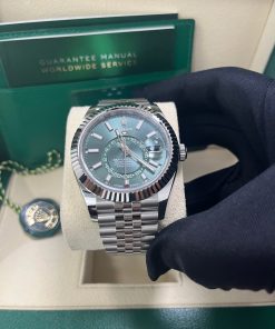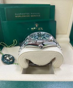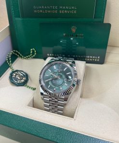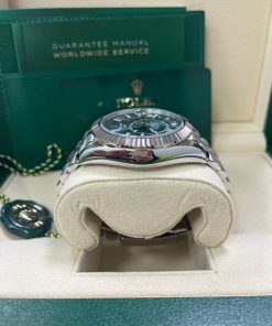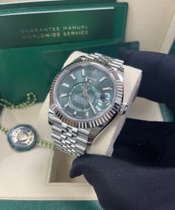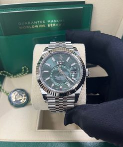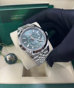 42mm white Rolesor case comprised of Oystersteel and white gold, screw-down back, screw-down crown with twinlock double waterproofness system, fluted, bidirectional rotatable rolex ring command bezel, scratch-resistant sapphire crystal with cyclops lens over the date, mint green dial, index hour markers, 9002, manufacture Rolex perpetual self-winding, dual time zones, annual calendar movement with centre hour, minute and seconds hands, 24-hour display on off-centre disc, second time zone, instantaneous annual calendar at 3 o’clock and rapid-setting of the date, month display via 12 apertures around the circumference of the dial, and stop-seconds for precise time setting, approximately 72 hours of power reserve, Jubilee bracelet with five-piece links, folding Oysterclasp buckle with Easylink 5mm comfort extension link. Waterproof to 100 metres / 330 feet.