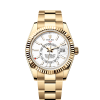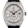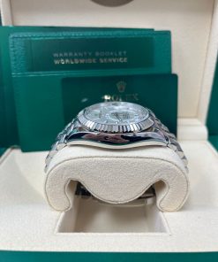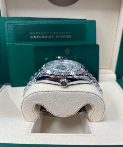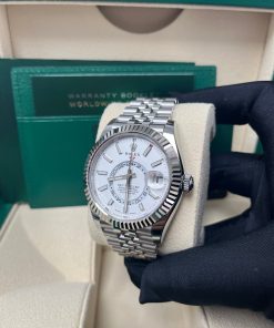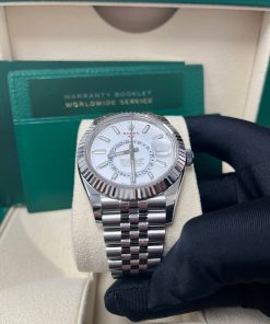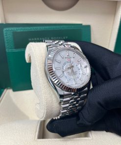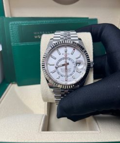 42mm white Rolesor case comprised of a 904L steel monobloc middle case, screw-down back, screw-down crown, 18K white gold fluted bezel with bidirectional rotatable Rolex Ring Command, scratch-resistant sapphire crystal with cyclops lens over the date and double anti-reflective coating, white dial, index hour markers, Rolex calibre 9001 automatic movement , second time-zone displayed via off-center rotating disc, Saros annual calendar with date at 3 o’clock and month indicated in discrete apertures at each of the 12 hour marks, stainless steel Oyster bracelet, folding Oysterclasp buckle with Easylink 5mm comfort extension link. Waterproof to 100 meters.
