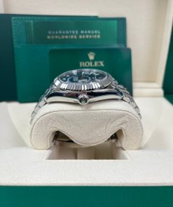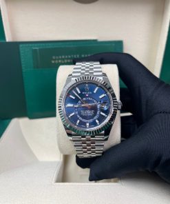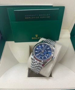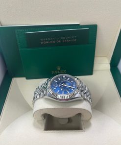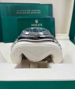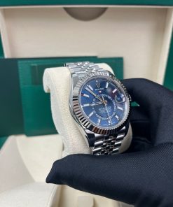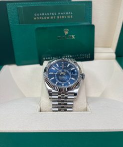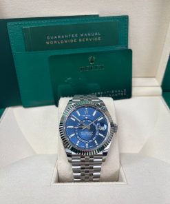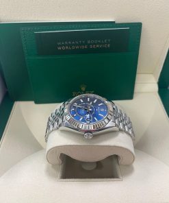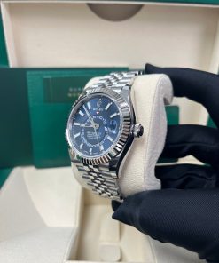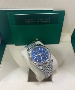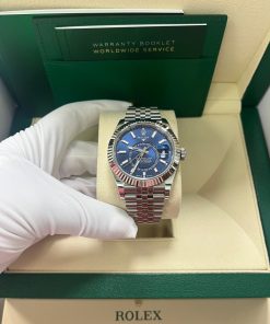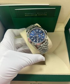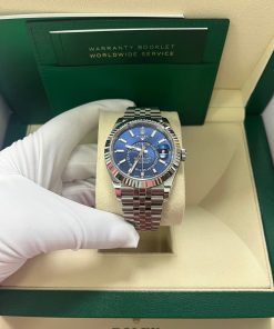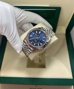 42mm white Rolesor case comprised of Oystersteel and white gold, screw-down back, screw-down crown with twinlock double waterproofness system, fluted, bidirectional rotatable rolex ring command bezel, scratch-resistant sapphire crystal with cyclops lens over the date, bright blue dial, index hour markers, 9002, manufacture Rolex perpetual self-winding, dual time zones, annual calendar movement with centre hour, minute and seconds hands, 24-hour display on off-centre disc, second time zone, instantaneous annual calendar at 3 o’clock and rapid-setting of the date, month display via 12 apertures around the circumference of the dial, and stop-seconds for precise time setting, approximately 72 hours of power reserve, Jubilee bracelet with five-piece links, folding Oysterclasp buckle with Easylink 5mm comfort extension link. Waterproof to 100 metres / 330 feet.