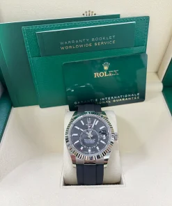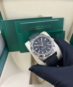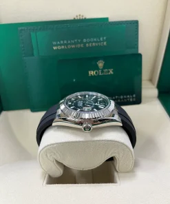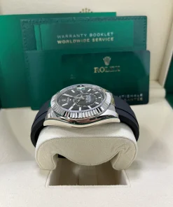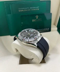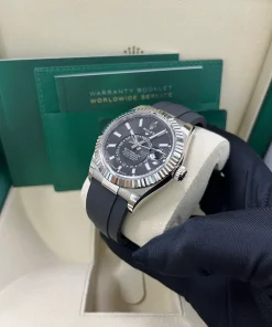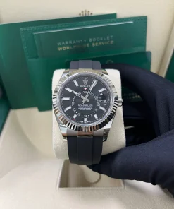 The Oyster Perpetual Sky-Dweller in 18 ct white gold with a bright black dial and an Oysterflex bracelet.