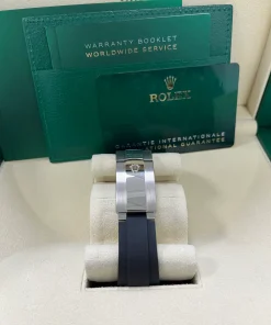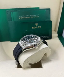 The blade is overmoulded with high-performance black elastomer which is particularly resistant to environmental effects, very durable and perfectly inert for the wearer of the watch. For enhanced comfort, the inside of the Oysterflex bracelet is equipped with a patented longitudinal cushion system that stabilizes the watch on the wrist and fitted with an 18 ct white gold Oysterclasp. It also features the Rolex Glidelock extension system, designed by the brand and patented. This inventive toothed mechanism, integrated beneath the clasp, allows fine adjustment of the bracelet length by some 15 mm in increments of approximately 2.5 mm, without the use of tools.