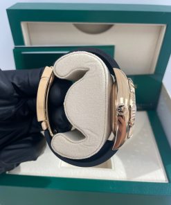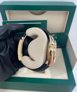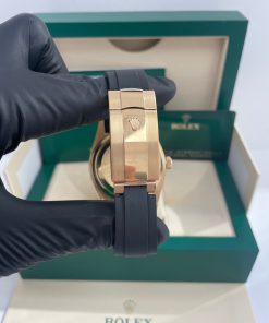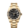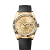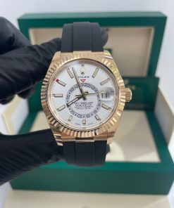 42mm 18K yellow gold case, screw-down back, screw-down crown with twinlock double waterproofness system, fluted bezel, scratch-resistant sapphire crystal with cyclops lens over the date, white dial, index hour markers, Rolex calibre 9001 automatic movement with 24-hour display on off-centre disc, second time zone, instantaneous annual calendar at 3 o’clock and rapid-setting of the date, month display via 12 apertures around the circumference of the dial, stop-seconds for precise time setting, approximately 72 hours of power reserve, Oysterflex bracelet made from flexible metal blades overmoulded with high-performance elastomer, folding Oysterclasp buckle with glidelock extension system. Waterproof to 100 meters.