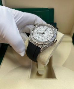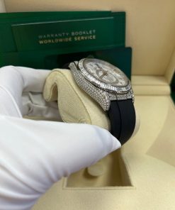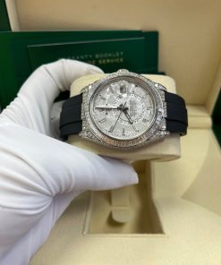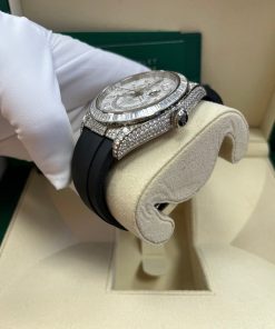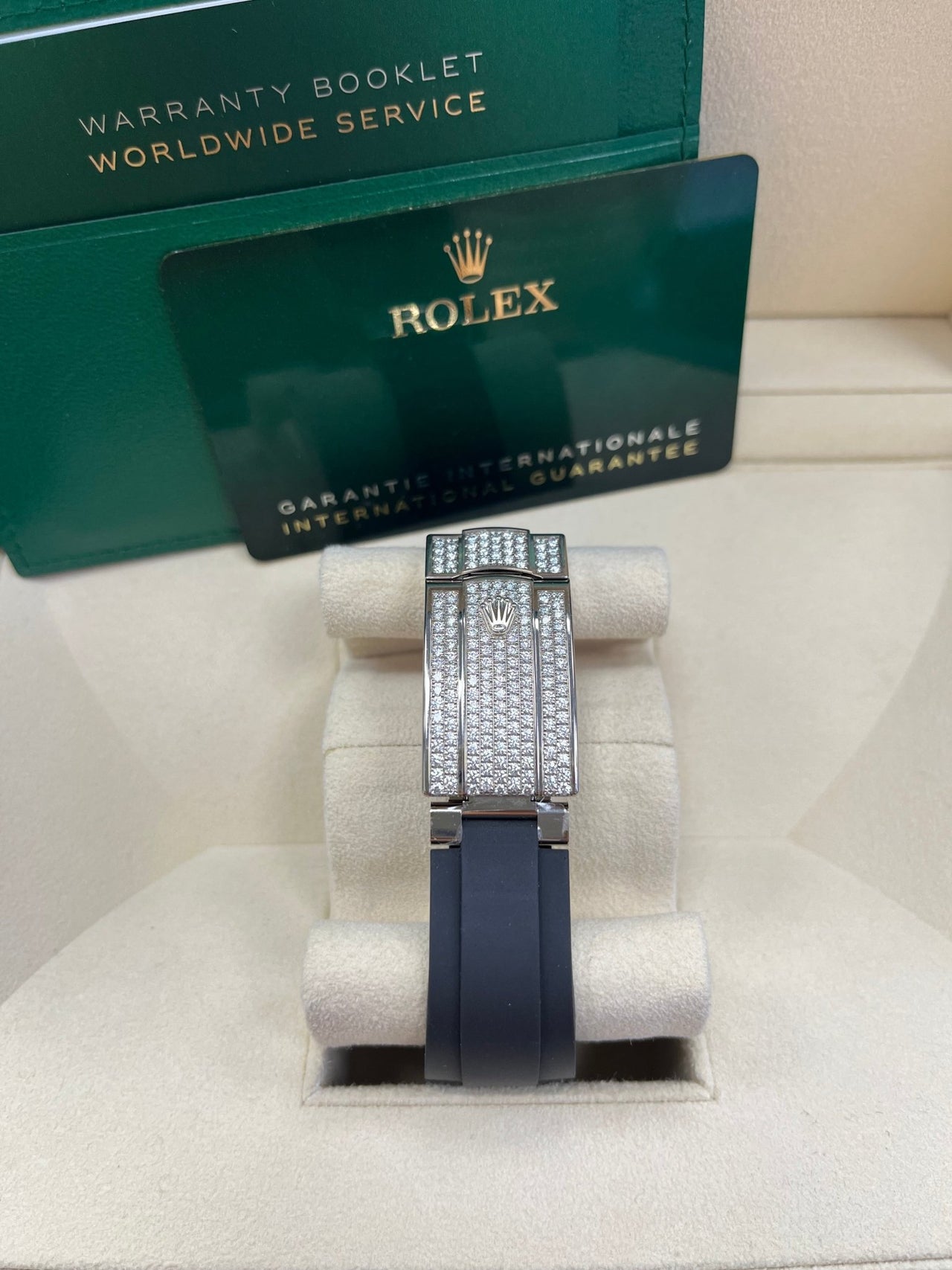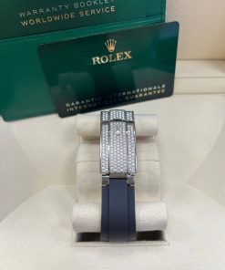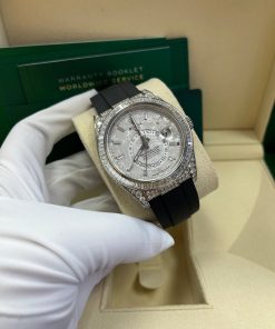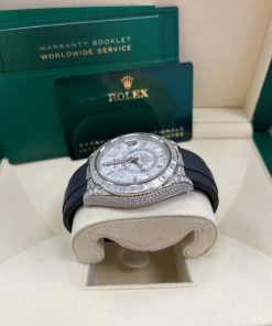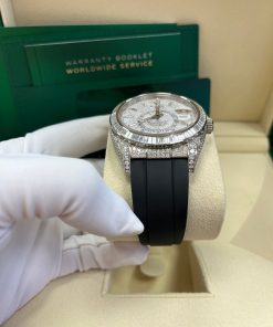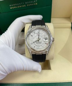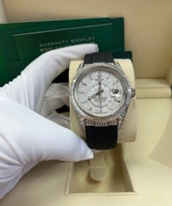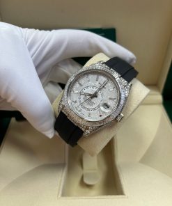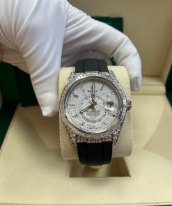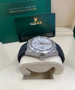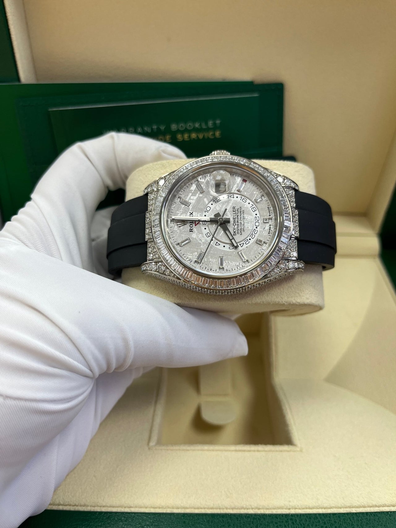 This Rolex Sky-Dweller 336259TBR is a designed in a 42mm white gold case covered in a stunning factory pavé diamond set. A meteorite dial features index hour markers, a date window at the 3 o’clock, an annual calendar, and GMT timekeeping functionality. Styled on a rubber bracelet with a bit of comfort, this incredible timepiece is the perfect companion for the exuberant traveling watch enthusiast.