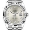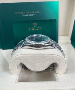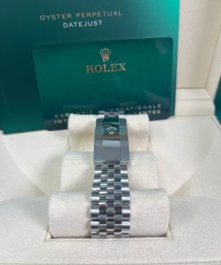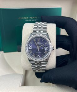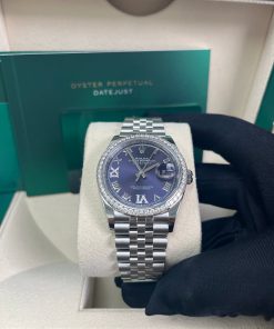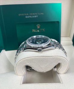 36mm Oystersteel case, screw-down steel back, screw-down crown with twinlock double waterproofness system, diamond bezel, scratch-resistant sapphire crystal with cyclops lens over the date, aubergine dial, Roman numerals with diamond set 6 and 9, Rolex calibre 3235 perpetual self-winding movement with center hour, minute and seconds hands, instantaneous date at 3 o’clock with rapid setting, and stop-seconds for precise time setting, approximately 70 hours of power reserve, Jubilee bracelet with five-piece links, folding Oysterclasp buckle with Easylink 5mm comfort extension link. Waterproof to 100 meters.