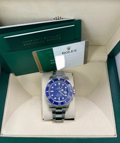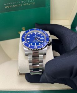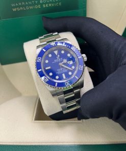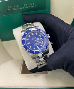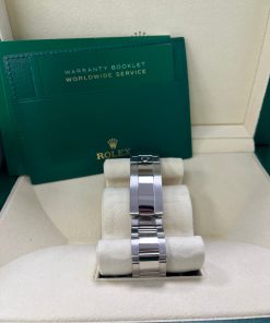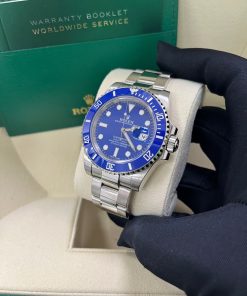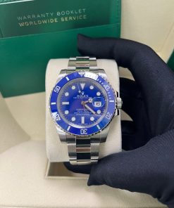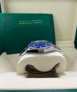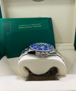 18k white gold case with a white gold-tone 18kt white gold rolex oyster bracelet. Unidirectional rotating blue top ring 18k white gold bezel. Blue dial with silver-tone Mercedes-logo, sword, and Breguet-style shape hands and dot hour markers. Minute markers around the outer rim. Dial Type: Analog. Luminescent hands and dial markers. Date display at the 3 o’clock position. Rolex Calibre 3135 automatic movement with a 50-hour power reserve. Scratch resistant sapphire crystal. Screw down crown. Solid case back. Round case shape. Case size: 40 mm. Oysterlock clasp. Water resistant at 300 meters / 1000 feet. Functions: date, hour, minute, second, chronometer. Luxury watch style. Watch label: Swiss Made.