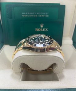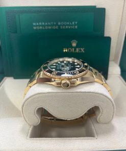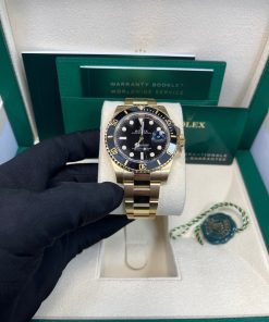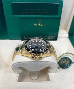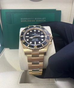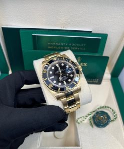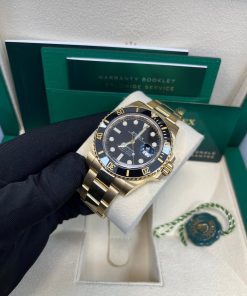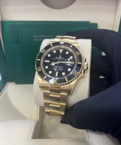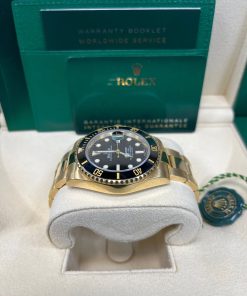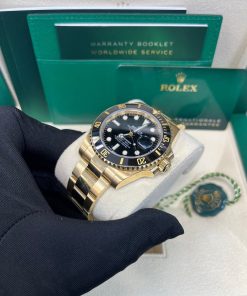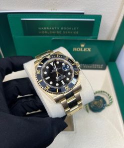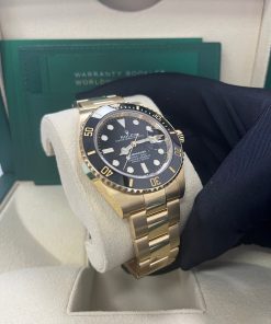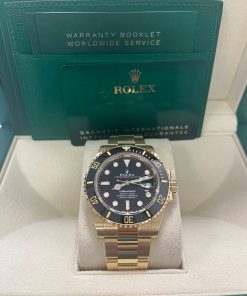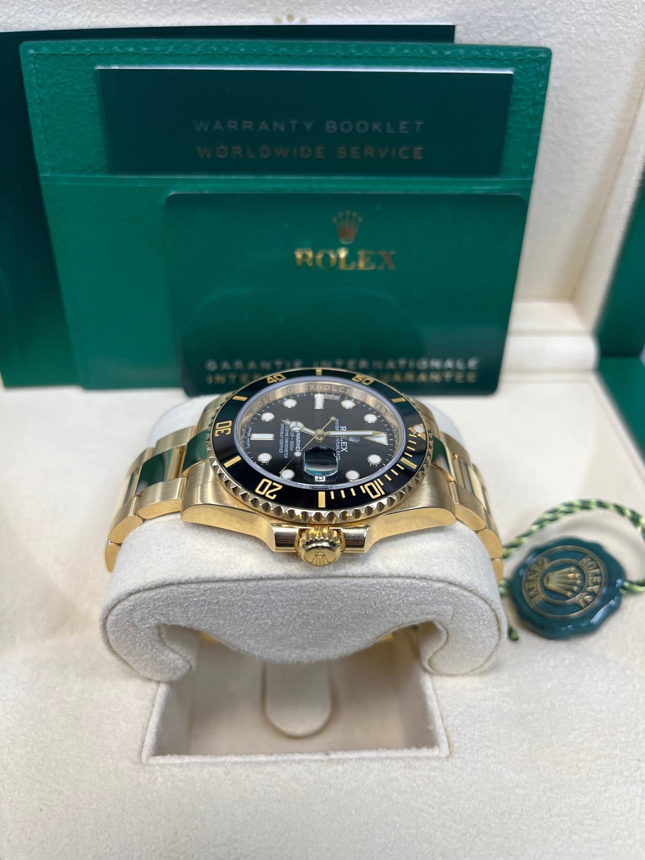 The Oyster Perpetual Submariner Date in 18 ct yellow gold with a Cerachrom bezel insert in black ceramic and a black dial with large luminescent hour markers.