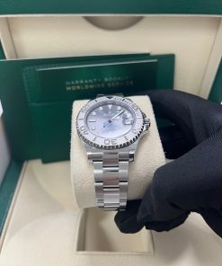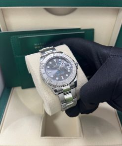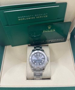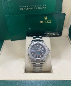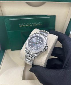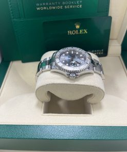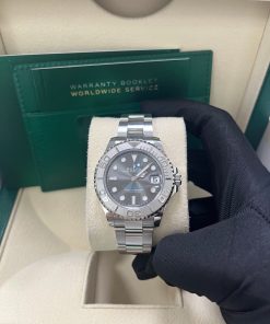 37mm Rolesium case comprised of a 904L steel monobloc middle case, screw-down steel back, screw-down steel crown, 950 platinum bidirectional rotatable bezel with raised polished numerals and graduations over a sand-blasted background, scratch-resistant sapphire crystal with cyclops lens over the date, dark rhodium dial, white gold applied hour markers with blue Chromalight luminescence, Rolex calibre 2236 automatic movement, approximately 55 hours of power reserve, stainless steel Oyster bracelet with flat three-piece links, folding Oysterlock buckle with Easylink 5mm comfort extension link. Waterproof to 100 meters.