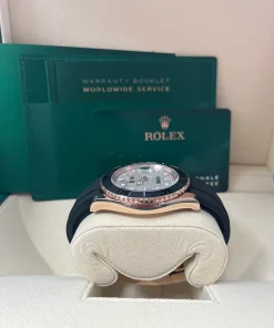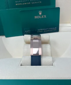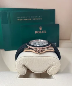 The blade is overmoulded with high-performance black elastomer which is particularly resistant to environmental effects, very durable and perfectly inert for the wearer of the watch. For enhanced comfort, the inside of the Oysterflex bracelet is equipped with a patented longitudinal cushion system that stabilizes the watch on the wrist and fitted with an 18 ct Everose gold Oysterlock safety clasp. It also features the Rolex Glidelock extension system, designed by the brand and patented. This inventive toothed mechanism, integrated beneath the clasp, allows fine adjustment of the bracelet length by some 15 mm in increments of approximately 2.5 mm, without the use of tools.