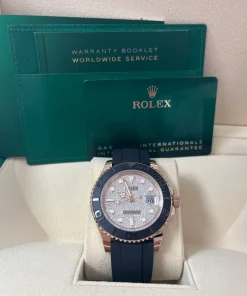 The Yacht-Master’s new Oysterflex bracelet, developed by Rolex and patented, offers a sporty alternative to metal bracelets. The bracelet attaches to the watch case and the Oysterlock safety clasp by a flexible titanium and nickel alloy metal blade.