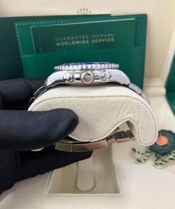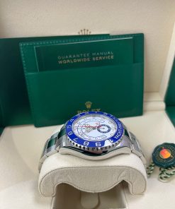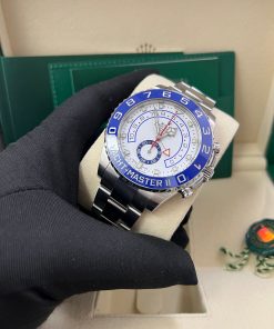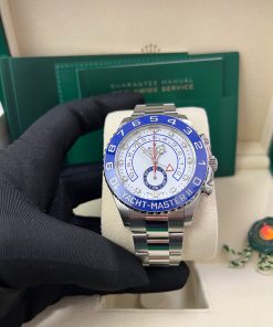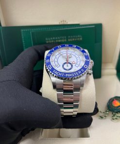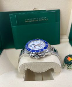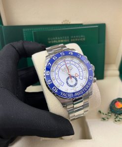 The Yacht-Master II 44mm stainless steel case, 90-degree rotatable Command bezel with blue Cerachrom insert, matte white dial with blue lacquer small seconds counter, automatic movement with a programmable countdown function, stainless steel bracelet with Oysterlock safety clasp, and 5mm comfort extension link. Water-resistant up to 100 meters.