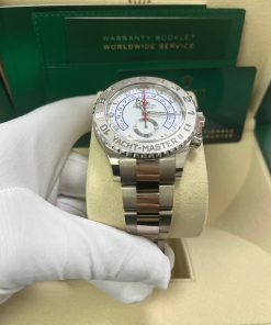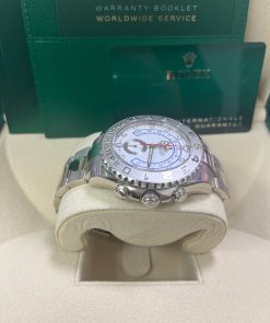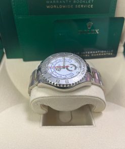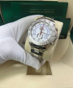 This white-on-white Rolex Yacht-Master II features a substantial 44mm case crafted from 18kt white gold, paired with a .950 platinum bezel. This “Ring Command” bezel is exclusive to the Yacht-Master and functions as a programmable countdown timer for competitive sailors.