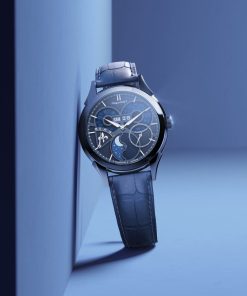 The Royale Saphir “Time of Colours” range, aligning with PEQUIGNET’s artistic and engineering expertise, integrates these colors into every aspect of the watch, including the alligator strap, dial, case, hands, and date and moon phase discs, resulting in a sophisticated ‘color block’ effect. The 42mm diameter cases, crafted in polished steel with a DLC treatment, undergo an exclusive coloring process through cathodic spraying for a flawless finish, blending technical excellence with aesthetic appeal.