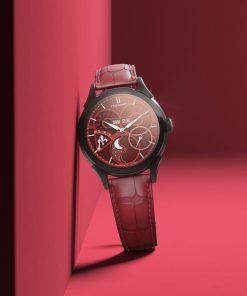 The Royale Saphir “Time of Colours” range, aligning with PEQUIGNET’s artistic and engineering expertise, integrates these colors into every aspect of the watch, including the alligator strap, dial, case, hands, and date and moon phase discs, resulting in a sophisticated ‘color block’ effect. The 42mm diameter cases, crafted in polished steel with a DLC treatment, undergo an exclusive coloring process through cathodic spraying for a flawless finish, blending technical excellence with aesthetic appeal.
