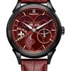 The Royale Saphir “Time of Colours” range, aligning with PEQUIGNET’s artistic and engineering expertise, integrates these colors into every aspect of the watch, including the alligator strap, dial, case, hands, and date and moon phase discs, resulting in a sophisticated ‘color block’ effect. The 42mm diameter cases, crafted in polished steel with a DLC treatment, undergo an exclusive coloring process through cathodic spraying for a flawless finish, blending technical excellence with aesthetic appeal.