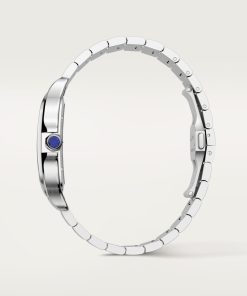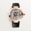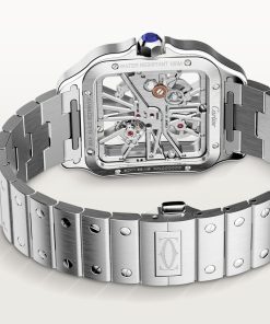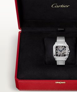 Santos Skeleton watch, large model, Manufacture mechanical movement with manual winding, caliber 9611 MC. Steel case, seven-sided crown set with a faceted sapphire, blued-steel sword-shaped hands, sapphire crystal and case back. Steel bracelet with “SmartLink” adjustment system. Second strap in alligator skin, with steel interchangeable deployant buckle. Both are equipped with the “QuickSwitch” interchangeability system. Hours and minutes with skeletonized bridges forming Roman numerals. Individually numbered movement consisting of 138 parts including 20 rubies. Movement dimensions: 28 mm x 28 mm, movement thickness: 3.97 mm, balance: 28,800 vibrations/hour, power reserve approx. 72 hours. Case width: 39.8 mm, thickness: 9.08 mm. Water-resistant up to 10 bar (approx. 100 meters/330 feet).
