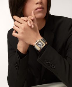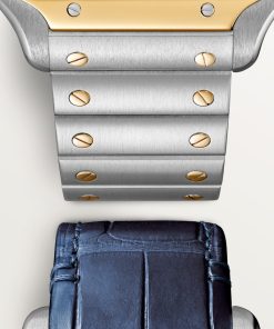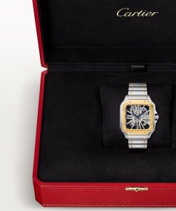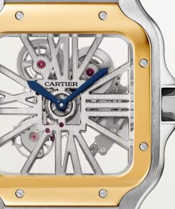 Santos Skeleton watch, large model, Manufacture mechanical movement with manual winding, caliber 9611 MC. Steel case, yellow gold 750/1000 bezel, 7-sided crown set with a faceted sapphire, blued-steel sword-shaped hands, sapphire crystal case back. Steel bracelet with “SmartLink” adjustment system. Second bracelet in veal leather, with double adjustable steel deployant buckle. Both bracelets are fitted with the “QuickSwitch” interchangeability system. Hours and minutes with skeletonized bridges forming Roman numerals. Individually numbered movement consisting of 138 parts including 20 rubies. Movement dimensions: 28 mm x 28 mm, movement thickness: 3.97 mm, balance: 28,800 vibrations/hour, power reserve approx. 72 hours. Case width: 39.7 mm, thickness: 9.08 mm. Water-resistant up to 10 bar (approx. 100 meters/330 feet).