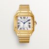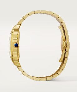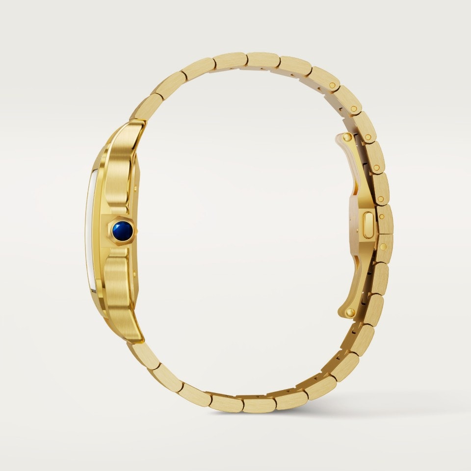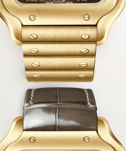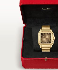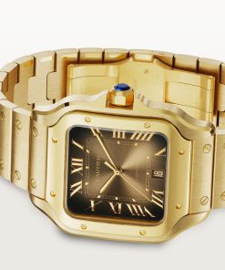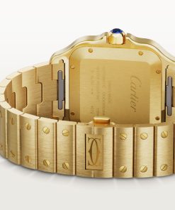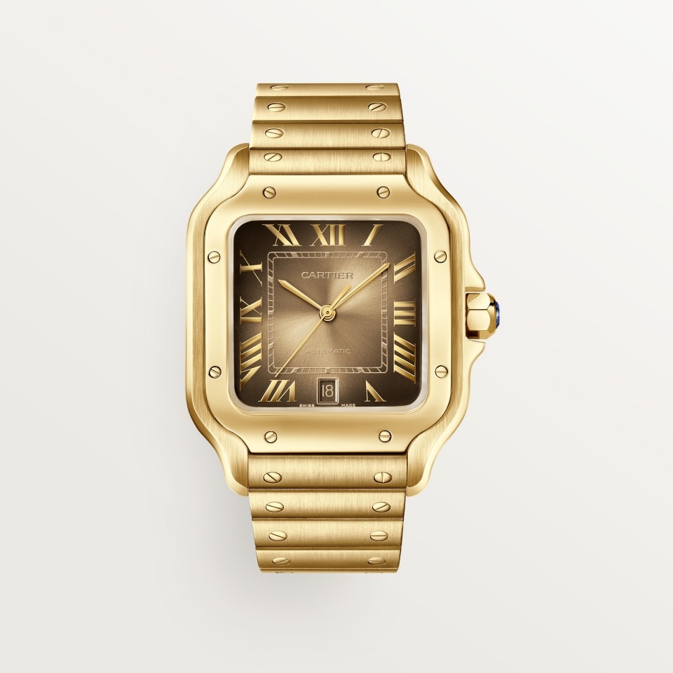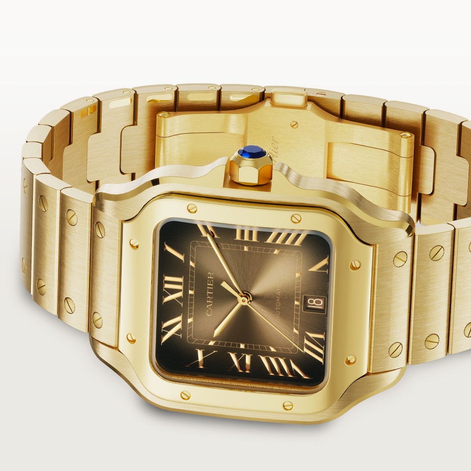 Santos de Cartier watch, large model, mechanical movement with automatic winding 1847 MC. 18K yellow gold (750/1000) case, 7-sided crown set with a faceted blue sapphire, satin-finish gradated gold sunray-brushed dial, gold-plated polished steel sword-shaped hands, sapphire crystal. Yellow gold bracelet with SmartLink adjustment system. Second strap in brown alligator leather, with interchangeable folding gold buckle. Both are fitted with the QuickSwitch interchangeable system. Case width: 39.8 mm, thickness: 9.38 mm. Water-resistant to 10 bar (approx. 100 meters).