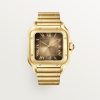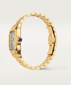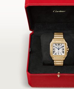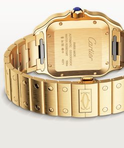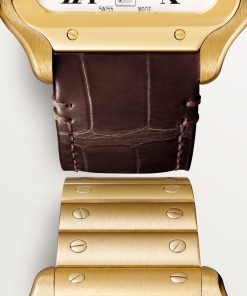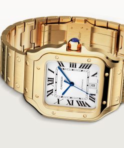 Santos watch, large model, mechanical movement with automatic winding, caliber 1847 MC. 18K yellow gold (750/1000) case, 18K yellow gold (750/1000) seven-sided crown set with a faceted sapphire, silvered opaline dial, blued-steel sword-shaped hands, sapphire crystal. 18K yellow gold (750/1000) bracelet with “SmartLink” adjustment system. Second alligator skin strap with 18K yellow gold (750/1000) interchangeable deployant buckle. Both are equipped with the “QuickSwitch” interchangeable system. Case width: 39.8 mm, thickness: 9.38mm. Water-resistant up to 10 bar (approx. 100 meters/330 feet).