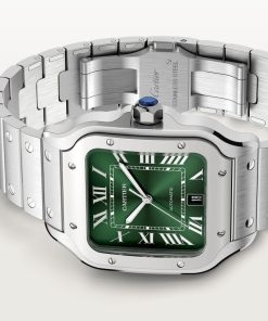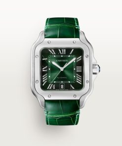 Santos de Cartier watch, large model, mechanical movement with automatic winding 1847 MC. Steel case, 7-sided crown set with a synthetic faceted blue spinel, graduated green dial, polished steel sword-shaped hands with luminescent material, sapphire crystal. Steel bracelet with SmartLink adjustment system. Second strap in green alligator skin, with interchangeable steel folding buckle. Both are fitted with the QuickSwitch interchangeable system. Case width: 39.8 mm, thickness: 9.38 mm. Water-resistant up to 10 bar (approx. 100 meters/330 feet).