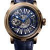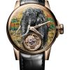The Savanna Tourbillon Cobra features an off-center flying tourbillon at 6 o’clock that compensates for gravity’s effects. It is powered by a hand-wound mechanism with twin barrels that provide a 96-hour power reserve. The watch is encased in an 18-carat 5N pink-gold, 40-millimeter case complemented by a domed sapphire crystal that displays the intricate puzzle and tourbillon details. The design is completed with open-worked horns that seamlessly integrate with the black alligator strap.