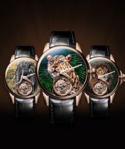 The Savanna Tourbillon Tiger features an off-center flying tourbillon at 6 o’clock that compensates for gravity’s effects. It is powered by a hand-wound mechanism with twin barrels that provide a 96-hour power reserve. The watch is encased in an 18-carat 5N pink-gold, 40-millimeter case complemented by a domed sapphire crystal that displays the intricate puzzle and tourbillon details. The design is completed with open-worked horns that seamlessly integrate with the black alligator strap.