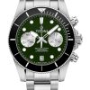 Dial layouts take cues from classic ‘60s chronographs, with a 30-minute counter at three, running seconds at nine, and a discreet date window at six. Available in matte black, blue, or green, the dials contrast beautifully with silver-toned, circular-brushed subdials, while Super-LumiNova® ensures clarity in the dark. A stainless-steel bracelet with a folding clasp, diver’s extension, and push-button micro-adjustment adds versatility. For a bolder statement, the bicolor variant brings black DLC-coated pushers and PVD-gold bezel accents—a rugged tool watch with just the right touch of sophistication.
