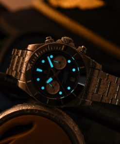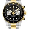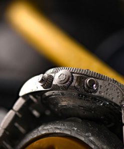 Dial layouts take cues from classic ‘60s chronographs, with a 30-minute counter at three, running seconds at nine, and a discreet date window at six. Available in matte black, blue, or green, the dials contrast beautifully with silver-toned, circular-brushed subdials, while Super-LumiNova® ensures clarity in the dark. A stainless-steel bracelet with a folding clasp, diver’s extension, and push-button micro-adjustment adds versatility. For a bolder statement, the bicolor variant brings black DLC-coated pushers and PVD-gold bezel accents—a rugged tool watch with just the right touch of sophistication.