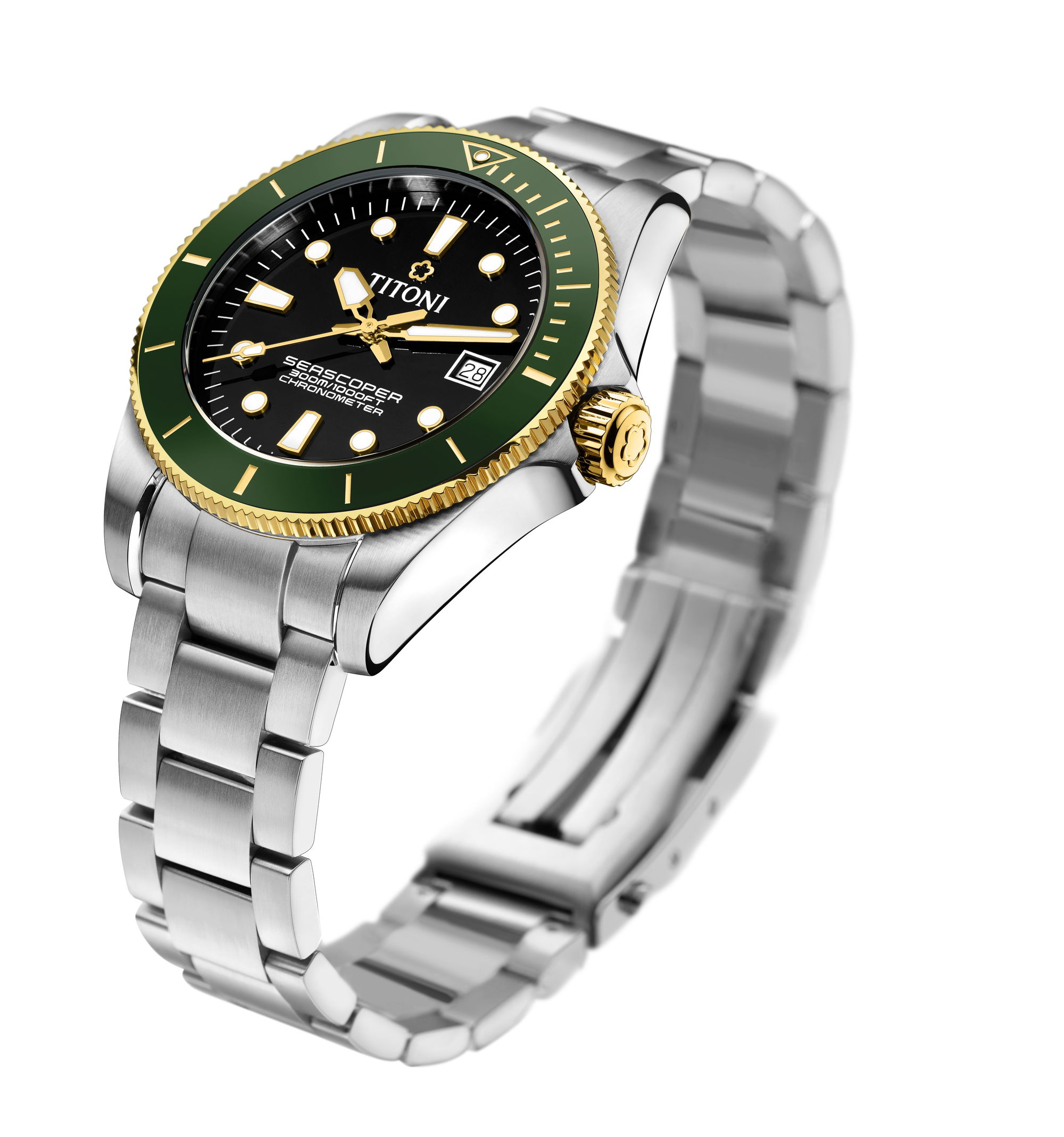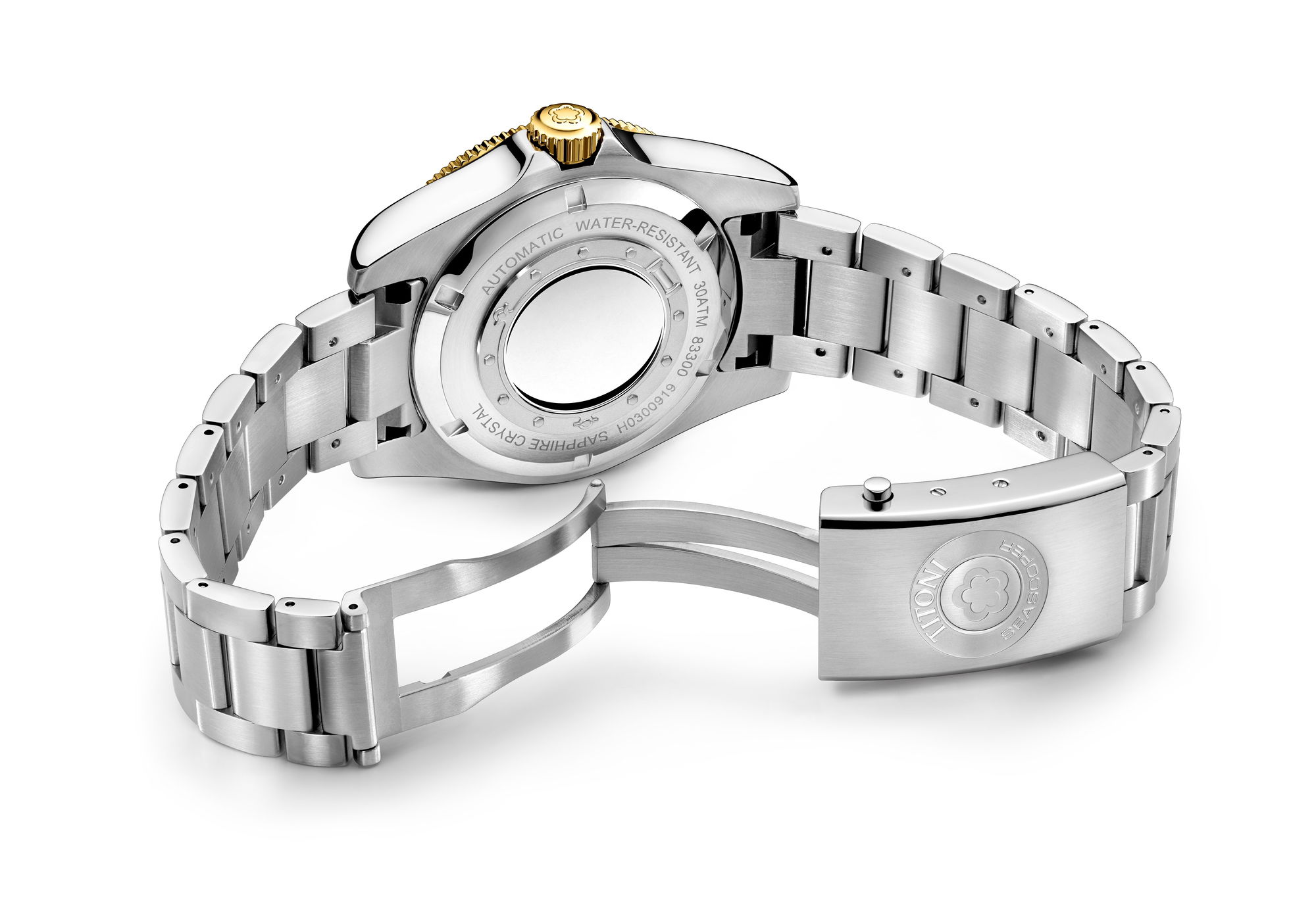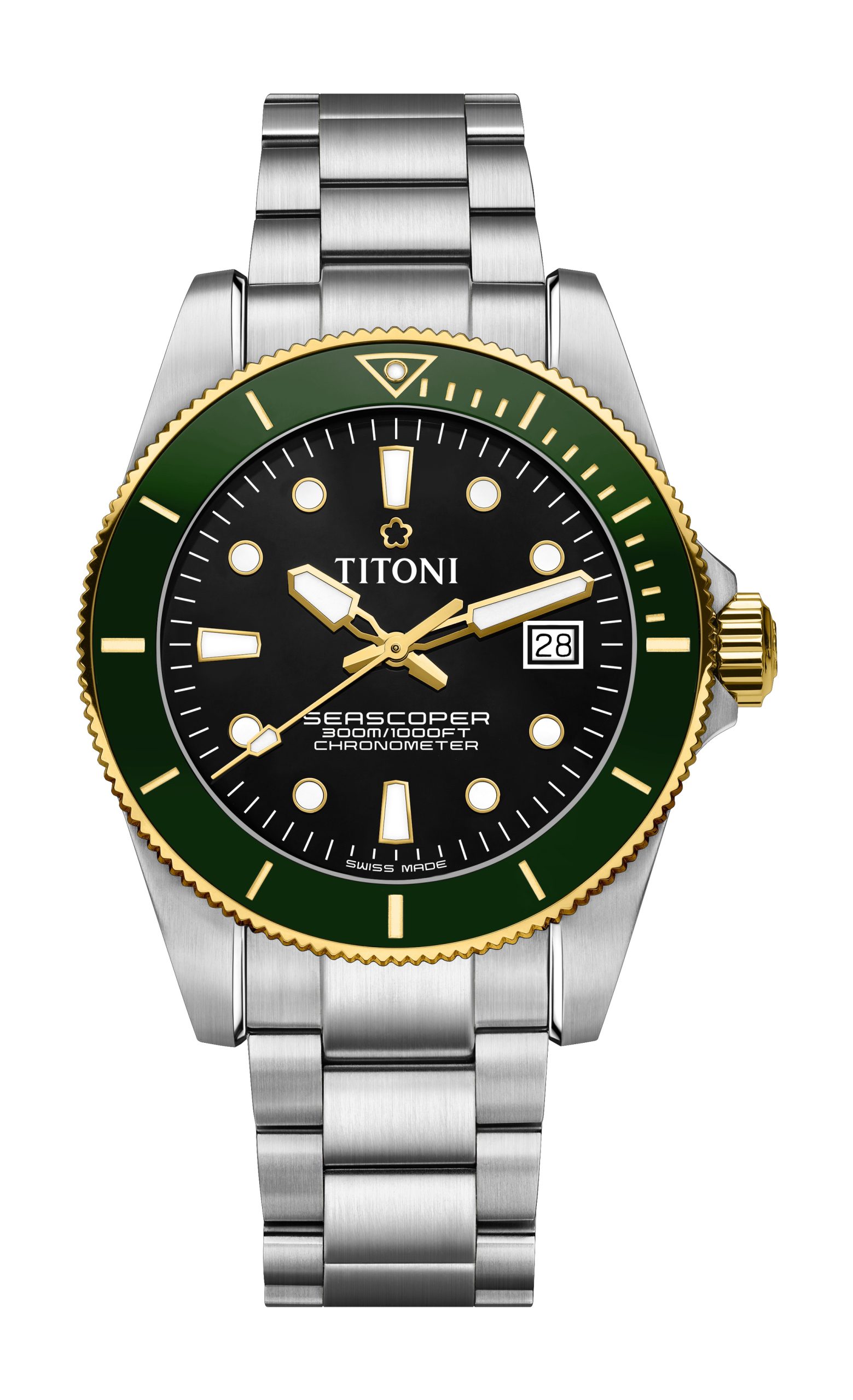 The new Titoni Seascoper 300 Bicolor blends rugged dive watch performance with a refined, sophisticated design, a balance that will appeal to the discerning enthusiast. Under the stewardship of Marc and Olivier Schluep, the fourth generation of Titoni’s founding family, the Seascoper 300 has been reimagined with an elegant flair. The Seascoper 300’s golden Luminova-filled hands and black lacquered dial stand out at first glance, while the textured ceramic bezel, available in a trio of color options, offers both beauty and function. There’s also a choice between two bracelet designs, one featuring gold-plated center links and one in stainless steel.
